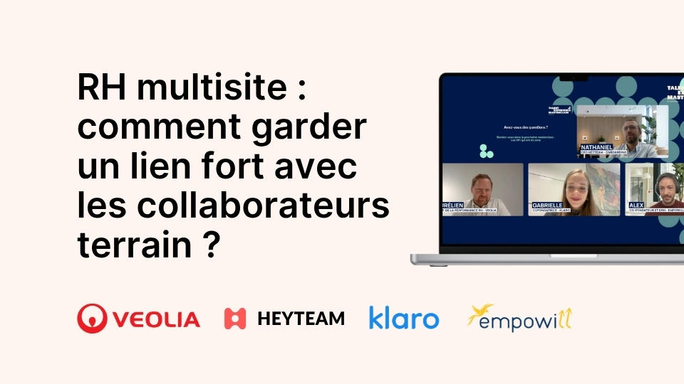 Regardez le replay de notre masterclass avec Veolia, HeyTeam et Klaro : découvrez les 7 leviers concrets pour renforcer la proximité RH avec les collaborateurs terrain, même à distance.